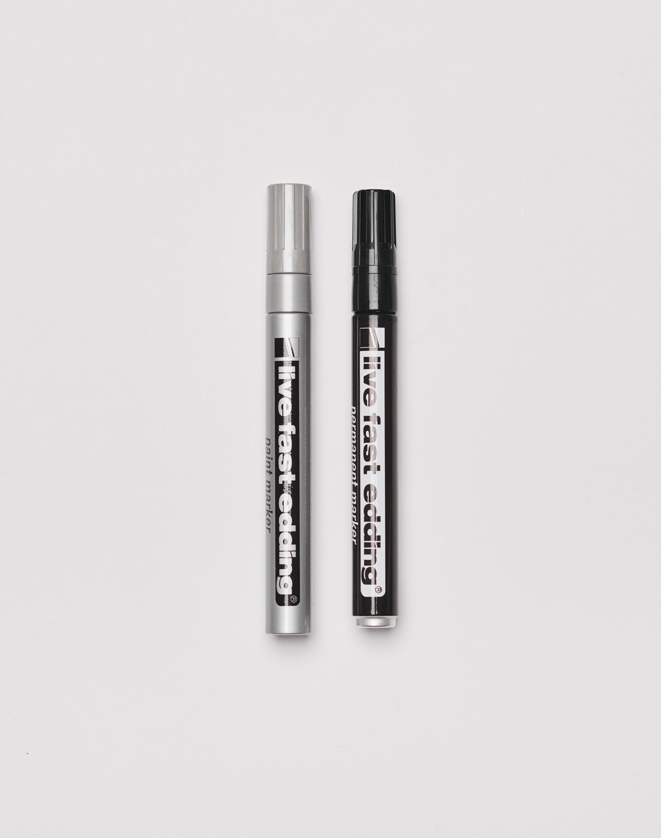 In homage to early graffiti culture, the streetwear label Live Fast Die Young is presenting two limited edition Live Fast edding markers for its spring collection. In addition to the new collection drop "Hit And Run", consisting of around 50 pieces, the two Live Fast edding markers are available in black and silver.